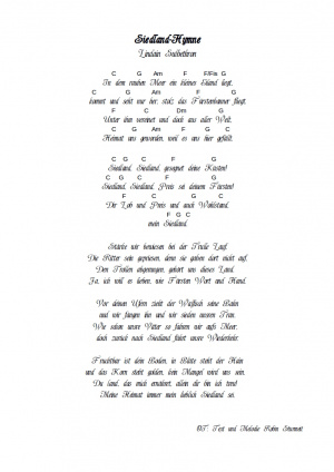 Im Jahre 24 Rupert schriebt Fürst Rupert einen Wettstreit aus, an dem sich sowohl Siedländer als auch Ausländer beteiligen konnten. Ziel war es, eine neue Hymne für Siedland zu finden. Aus den zahlreichen Einsendungen und Vorschlägen wurde schließlich das folgende Lied aus der Feder von Lindain Sûlbethron ausgewählt und zur offiziellen Hymne des Landes ernannt.